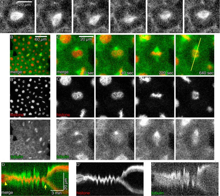 FIGURE 1:. Tubulin and histone highlight mitotic landmarks. (A) eGFPâα-tubulin (GFP-Tub) highlights the highly dynamic mitotic spindle in the X. laevis embryo. (B) X. laevis gastrula animal caps contain a field of asynchronous epithelial cells, visualized with mCherry-histone H2B (mChe-H2B; Bâ²) and GFP-Tub (Bâ²â²). (C) Mitotic temporal landmarks are apparent in cells expressing mChe-H2B and GFP-Tub, including NEB (frames 1 and 2), formation of the metaphase plate (frame 3), and segregation of chromosomes in anaphase (frame 4). The line in frame 4 through the spindle poles at anaphase onset was used to generate a kymograph (D), highlighting NEB (arrowhead), anaphase onset (arrow), and spindle movements in preanaphase period.