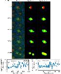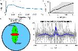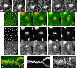 FIGURE 7:. Analysis of spindle pole movements. (A) Averaged power spectral density of 100 automatically calculated spindle rotational trajectories in the 150 s before anaphase onset reveals a similar maximum to that seen in manually analyzed spindles. (B) Mean square displacement of 200 metaphase spindle pole locations reveals an initial supralinear (directed) behavior and later infralinear (restricted) behavior. Black line represents mean MSD; gray areas indicates SD. (C) Diagram of spindle-based moving reference frame used to highlight spindle dynamics. Cross-correlation of radial velocity components (D) demonstrates correlated movement at zero time lag, as well as outlying peaks (−50 and 50 s) indicative of oscillation.