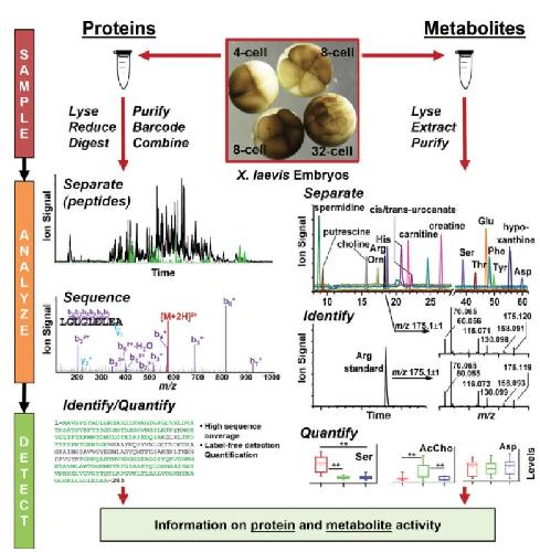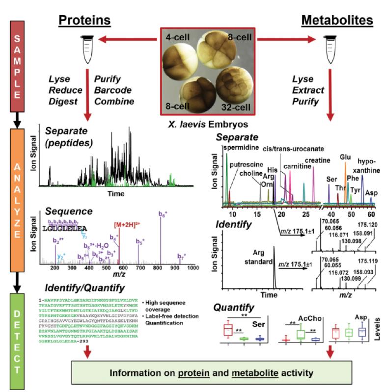 Figure 1. General MS strategy to detect proteins (left column) and small molecules (right column) in Xenopus laevis embryos. Proteins and metabolites are extracted, processed, separated, and identified. Quantitative approaches are used to determine relative or absolute levels of hundreds-to-thousands of these molecules. (Figures adapted with permission from references (Lombard-Banek et al., 2016b; Onjiko et al., 2015; Onjiko et al., 2016b)) |