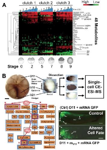 Figure 4. Uncovering metabolic processes during early development of the Xenopus laevis embryo. (a) By quantifying 48 different metabolites, LC-MS uncovered metabolomic remodeling during early embryonic development between stages 0 and 9. (b) Our single-cell analysis pipeline uncovered metabolic differences between single embryonic cells (blastomeres) in the 16-cell embryo (top panel). Metabolite network reconstruction based on the Kyoto Encyclopedia of Genes and Genomes (KEGG) (bottom left panel). Single-cell CE-ESI-MS revealed different metabolic activities between D11 and V11 cells; acetylcholine and methionine were enriched in the V11 blastomere. Tracking cell fates by micro-injection of mRNA encoding the green fluorescent protein (GFP) (bottom right panels). D11 blastomeres, which normally give rise to neural tissues (see âControlâ), alter their cell fate upon microinjection of histidine and threonine in a concentration endogenous to V11 cells (see âAltered Cell Fateâ). Scaleâ=â275 µm. (Figures adapted with permission from references (Onjiko et al., 2015; Vastag et al., 2011)) |