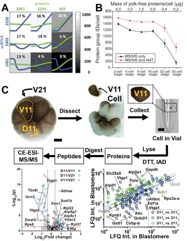 Figure 2. Quantification of protein production in the developing Xenopus laevis embryo by MS. (a) Comparison of gene transcription and translation in the developing embryo using Next-Generation Sequencing and liquid chromatography MS. (b) Liquid chromatography MS detection of proteins in cells isolated from the embryo at different developmental stages. (c) Our single-cell capillary electrophoresis MS approach enabled the discovery characterization of protein differences between identified single cells in the 16-cell embryo (top panel). This technology found proteomic differences between neural-fated D11, epidermal-fated V11, and hindgut-fated V21 cells (bottom left panel). The analysis also revealed detectable proteomic heterogeneity between D11 cells that were isolated from different embryos (bottom right panel). Scale bar = 200 µm (embryo), 1.25 mm (vial). (Figures adapted with permission from references (Lombard-Banek et al., 2016c; Lombard-Banek et al., 2016d; Peshkin et al., 2015; Sun et al., 2016)) |