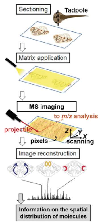 Figure 3. General strategy of mass spectrometry (MS) imaging. Focused projectiles (e.g., laser light, ions, charged particles or droplets) are used to desorb proteins and metabolites pixel by pixel on a sectioned sample (e.g., tadpole shown), usually by scanning the tissue section in three dimensions with an X-Y-Z translation stage. These molecules are ionized and detected by a mass spectrometer. The spatial distribution of the detected signal is reconstructed by mapping the ion signal abundance to the pre-recorded X-Y-Z coordinates. (Figure adapted with permission from reference (Goto-Inoue et al., 2016)) |