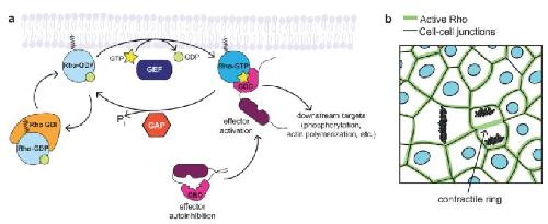 Rho GTPase activity is tightly regulated to create distinct zones of activation. a. Typical Rho family GTPases cycle between an active, GTP-bound state and an inactive, GDP-bound state. Guanine nucleotide exchange factors (GEFs) promote the active state by exchanging GDP for GTP, while GTPase activating proteins (GAPs) inactivate GTPases by stimulating GTP hydrolysis. Rho guanine nucleotide dissociation inhibitor (Rho GDI) sequesters Rho-GDP in the cytoplasm, protecting it from degradation and preventing its activation. In the active conformation, Rho GTPases activate effectors through direct binding, usually by relieving an autoinhibited conformation, allowing effectors to act on their downstream targets. b. RhoA is active in distinct zones in epithelia: at cellâcell junctions and at the contractile ring of dividing cells.