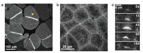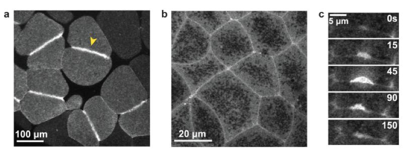Rho zones and Rho flares in X. laevis embryos. a. GFP-rGBD (GBD probe for active Rho) in the large blastomeres of the early X. laevis embryo. A distinct zone of active Rho specifies the position of the contractile ring (yellow arrowhead). b. GFP-rGBD in epithelial cells of the gastrula-stage X. laevis embryo. Zones of active Rho encircle the perimeter of each epithelial cell. c. A montage depicting a Rho flare over time. These transient accumulations of active Rho at cellâcell junctions were first observed in the X. laevis embryo (Reyes et al., 2014).