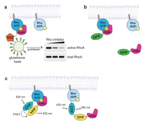 Approaches for studying active Rho GTPases. a. In the GBD affinity pull-down approach, the active GTPase is pulled down with a GST-tagged effector GBD specific for the GTPase of interest (rGBDâ=âRhotekin GBD, which binds RhoA, B, and C). The amount of GTPase in the pull-down is compared with total GTPase in the sample to approximate the pool of active GTPase in the sample. b. In the effector translocation (GBD probe) approach, the effector GBD is fluorescently-tagged (with GFP) and binds to the endogenous active GTPase. Local increase in fluorescence intensity over background is interpreted as increased active GTPase. c. In the GTPase-effector FRET biosensor (FRET biosensor) approach, the GTPase is tagged with a donor fluorophore (CFP) and the effector GBD is tagged with an acceptor fluorophore (YFP). A unimolecular Rho biosensor is shown here. When the GTPase is inactive, the donor fluorophore emits light. When the GTPase is active, the donor fluorophore excites the acceptor fluorophore.