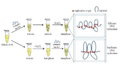 Exposure to mitotic environment increases replication efficiency of somatic nuclei. Cartoon showing somatic nuclei incubated in LSS before (top) or after CaCl2 addition (bottom) to release extracts in interphase. Mitotic activities induce chromosome formation (middle tube), thereby allowing resetting of the replicon. This allows somatic nuclei pre-incubated in mitosis (top) to have a shorter inter origin distance compared to somatic nuclei incubated directly in interphase (bottom). This is reflected in a more efficient DNA replication
