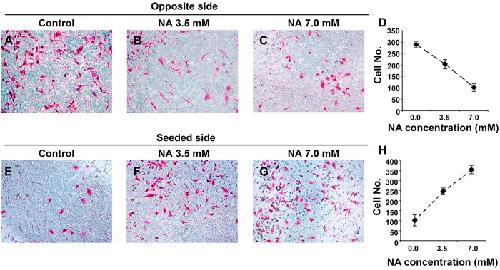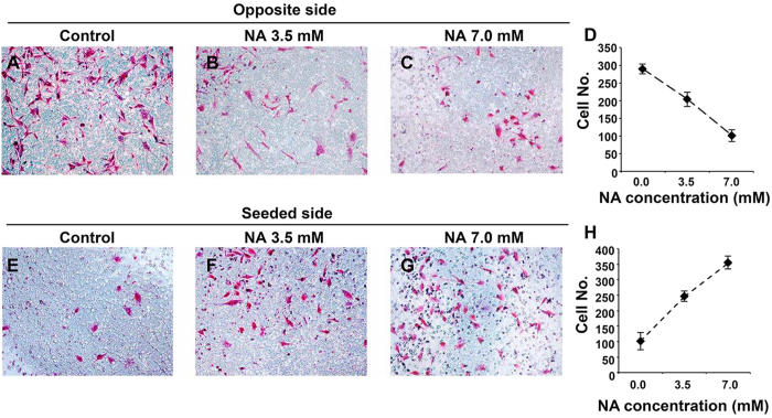 Figure 2. NA treatment inhibits U251 cell invasion in vitro.Transwell assays were carried out for U251 cells incubated in PBS (control) or the indicated concentration of NA as described in Methods. Images of cells (stained with Giemsa) that invaded through the matrigel (A–C) or remained on the seeded side (E–G) in a representative experiment are shown, and results of 15 different regions in 3 independent experiments (5 regions per experiment) are summarized in (D) and H for the opposite and seeded sides, respectively.