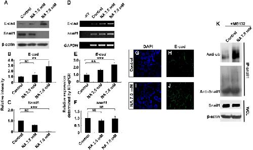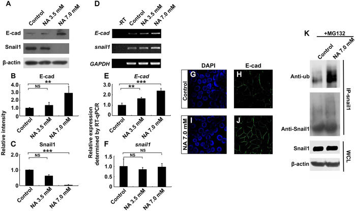 Figure 3. NA upregulates E-cadherin expression by promoting ubiquitination and degradation of Snail1.U251 cells were treated with PBS (control) or the indicated concentration of NA for 4âhr. (AâC) Western blot analyses for whole-cell lysates were performed with an anti-E-cadherin antibody. Membranes were stripped and reblotted for Snail1 and β-actin. Representative images of Western blots are shown in A, and relative intensity of E-cadherin and Snail1 normalized against β-actin was calculated and summarized in (B,C), respectively. (DâF) Total RNA was extracted, and RT-PCR was carried out for the transcripts of E-cadherin, snail1, and GAPDH. Representative images of semi-quantitative RT-PCR are shown in (D) and relative expression levels of E-cadherin and snail1 (normalized against GAPDH), as determined by RT-qPCR, are shown in (E,F) respectively. NS, not significant; **Pâ<â0.01; ***Pâ<â0.001. (GâJ) Cells were fixed and processed for DAPI staining (blue) and immunocytochemistry for E-cadherin (green). (K) U251 cells were treated with MG132 and NA or PBS (control), IP was carried out for cell lysates with an anti-Snail1 antibody, and Western blot was performed with an anti-ubiquitin antibody. Western blot for whole-cell lysates (WCL) was also performed separately with an anti-Snail1 antibody.