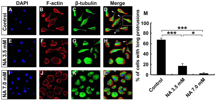 Figure 1. U251 cells lose mesenchymal phenotype upon NA treatment.U251 cells were incubated with PBS (control) or the indicated concentration of NA for 8 hr. Rhodamine phalloidin labeling for F-actin (red), immunocytochemistry for β-tubulin (green) and DAPI labeling for nuclei (blue) were carried out as described in Methods. White arrowheads denote the long protrusions that consist mainly of microtubules, and the inset in (D) shows an amplified image of the indicated protrusion. The percentage of cells with this type of long protrusions was calculated for each treatment and summarized in (F). *P < 0.05; ***P < 0.001.