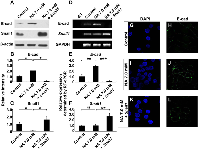 Figure 4. Snail1 reverses the effects of NA on E-cadherin expression.U251 cells were treated with PBS (control) or 7.0âmM NA for 4 hr, or transfected with a plasmid expressing Snail1 and then treated with 7.0âmM NA for 4 hr. (A) Western blot analyses for whole-cell lysates were performed with an anti-E-cadherin antibody. Membranes were stripped and reblotted for Snail1 and β-actin. Representative images of Western blots are shown in A, and relative intensity of E-cadherin and Snail1 normalized against β-actin was calculated and summarized in (B,C) respectively. (DâF) Total RNA was extracted, and RT-PCR was carried out for the transcripts of E-cadherin, snail1, and GAPDH. Representative images of semi-quantitative RT-PCR are shown in (D), and relative expression levels of E-cadherin and snail1 (normalized against GAPDH), as determined by RT-qPCR, are shown in E and F, respectively. NS, not significant; *Pâ<â0.05; **Pâ<â0.01; ***Pâ<â0.001. (GâL) Cells were fixed and processed for DAPI staining (blue) and immunocytochemistry for E-cadherin (green).