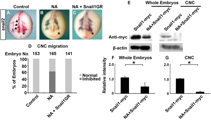 Figure 5. NA inhibits CNC migration in Xenopus embryos by inducing Snail1 degradation.(AâD) Xenopus embryos were injected in one blastomere at 2-cell stage with PBS (control; A), NA (70âng; B), or NA combined with mRNA encoding GR-fused Snail1 (C). To induce nuclear translocation of Snail1, dexamethasone was added at stage 10â10.5 (C). Embryos were cultured to stage ~18 and processed for in situ hybridization for snail2. The injected side (on the right and denoted with an asterisk) was labeled with co-injected β-galatosidase (red), and arrows indicate the directions of migration of the three CNC streams. A representative embryo from each group is shown in (AâC), and quantitative results are summarized in (D). (E) Embryos were injected with mRNA encoding myc-tagged Snail1, and cultured with or without NA until stage 15â17 (shortly before CNC migration). Western blot was carried out with an anti-myc antibody for whole-embryo lysates or lysates of dissected CNC. Representative images of Western blots are shown in (E), and relative intensity of myc-tagged Snail1 normalized against β-actin was calculated and summarized in (F) (whole embryos) and (G) (CNC). *Pâ<â0.05.
