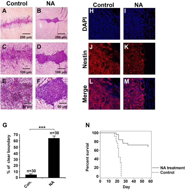 Figure 6. NA injection inhibits C6 glioma cell invasion in vivo and improves survival in a rat model of glioma.Rats allografted with C6 cells were injected with PBS (control) or NA as described in Methods. (A–G) Brain slices were collected and H&E staining was carried out. Representative images of brain slices collected from rats injected with PBS or NA are shown in (A–F) (with indicated magnification), and quantitative results from both groups (6 rats/group) are summarized in G. Arrows indicate C6 glioma cells. ***P < 0.001. (H–M) Brain slices were processed for DAPI staining (blue) and immunocytochemistry for Nestin (red). (N) NA significantly improved the survival of C6-allografted rats as compared with control (PBS; n = 25 for each group, P < 0.001).