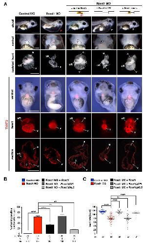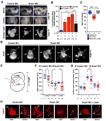 Fig. 7. : Cardiac phenotype after loss of Rcsd1 and after rescue with murine Rcsd1 constructs. A. Cardiac phenotype after Rcsd1 depletion and after rescue with murine Rcsd1 constructs at stage 43. The three upper rows show embryos from lateral and ventral view and the respective isolated hearts. The three lower rows show analysed ventricular trabeculation by cardiac Troponin T (Tnnt2) staining. Rows top to bottom: ventral view of the embryos, close-up of the respective hearts and section through the hearts cardiac phenotype after loss of Rcsd1 was rescued by co-injection with the full-length murine Rcsd1 construct and Rcsd1δNLS, although ventricular trabeculation was only partially restored to normal physical appearances. Rcsd1δCPI however was not able to restore cardiac anatomy and physiology. a, atrium; oft, outflow tract; t, trabeculae; v, ventricle, NLS: nuclear localization signal. (Lateral view: red arrowhead highlights cardiac edema upon loss of Rscd1. White arrow heads highlight the cardiac region in embryos of different rescue experiments. Scale bars: upper part: lateral view: 1000 μm; ventral view and isolated hearts: 250 μm; lower part Tnnt2: ventral view: 1000 μm; hearts and sections: 100 μm. B. Quantitative presentation of data shown in A. C. Injection of Rcsd1 MO lead to a reduced heart rate (beats per minute, bpm), which is rescued by co-injecting murine full-length Rcsd1 or Rcsd1δNLS mRNA but not by Rcsd1δCPI mRNA. n, number of independent experiments; N, number of analysed embryos; ng, nanogram. Error bars indicate standard error of the means (s.e.m.). n.s., not significant; **, pâ¤0.01; ****, pâ¤0.0001; calculated by a non-parametric Mann-Whitney rank sum test.