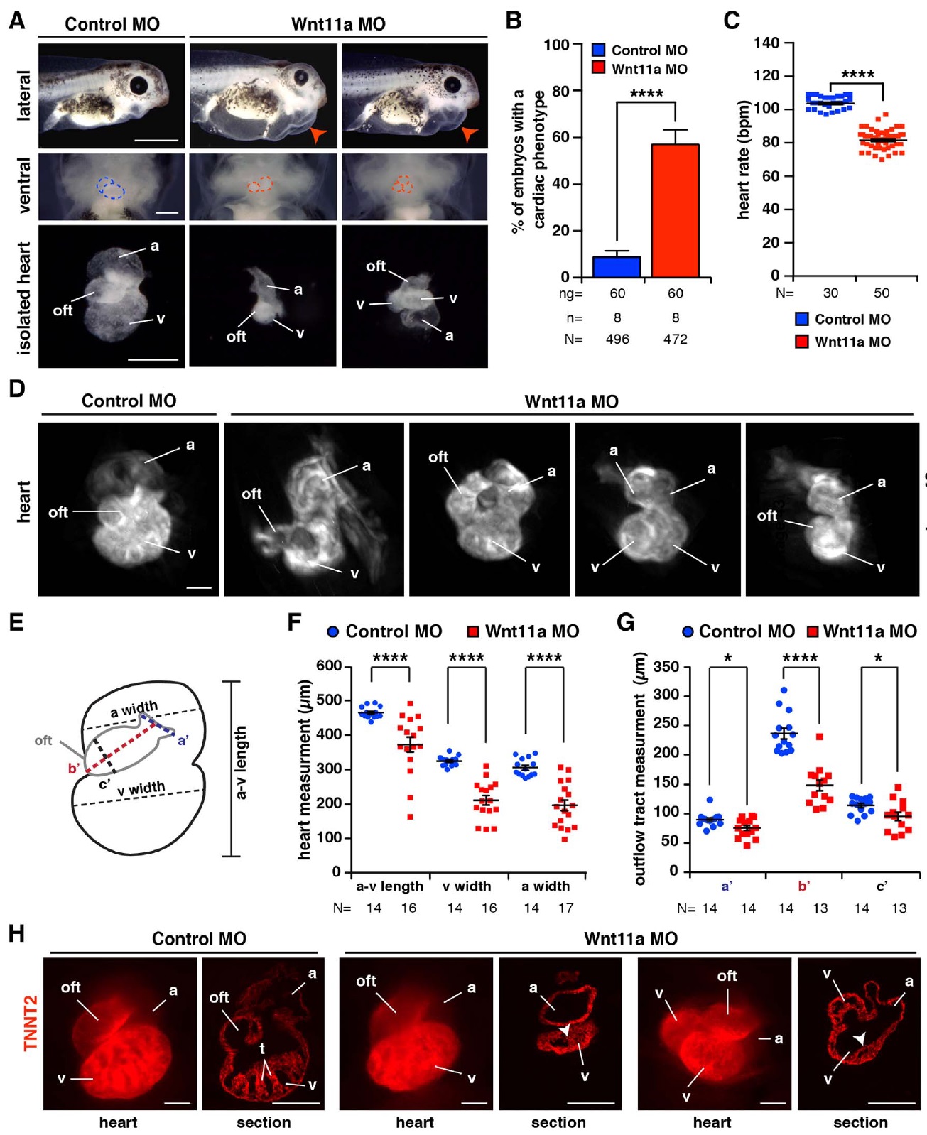 Fig. 1. : Depletion of Wnt11a disrupts cardiogenesis in Xenopus laevis. A. Wnt11a MO injection leads to a cardiac phenotype characterized by cardiac edema (lateral view, red arrowheads) and smaller, deformed hearts (ventral view, dotted lines; isolated hearts) at stage 43. Scale bars: lateral view: 1000 μm; ventral view and isolated hearts: 250 μm. B. Quantitative presentation of the data shown in A. C. The heart rate is significantly reduced in Wnt11a-depleted embryos. D-G. Analysis of cardiac Troponin T stained Wnt11a morphant hearts using OPT. Atrial width, ventricular width and a-v length were measured as indicated in E resulting in data provided in F. Measurement of the OFT was done as indicated in E. Data are given in G. Scale bar: 100 μm. H. Cardiac Troponin T (Tnnt2) staining shows that Wnt11a inhibition results in smaller and malformed hearts. Cross sections demonstrate a disturbed ventricular trabeculation (t). Scale bars: 100 μm. White arrowheads indicate disturbed trabeculation. a, atrium; bpm, beats per minute; n, number of independent experiments; N, number of analysed embryos; ng, nanogram; oft, outflow tract; v, ventricle. Error bars indicate standard error of the means (s.e.m.). *, pâ¤0.05; ****, pâ¤0.0001; calculated by a non-parametric Mann-Whitney rank sum test.