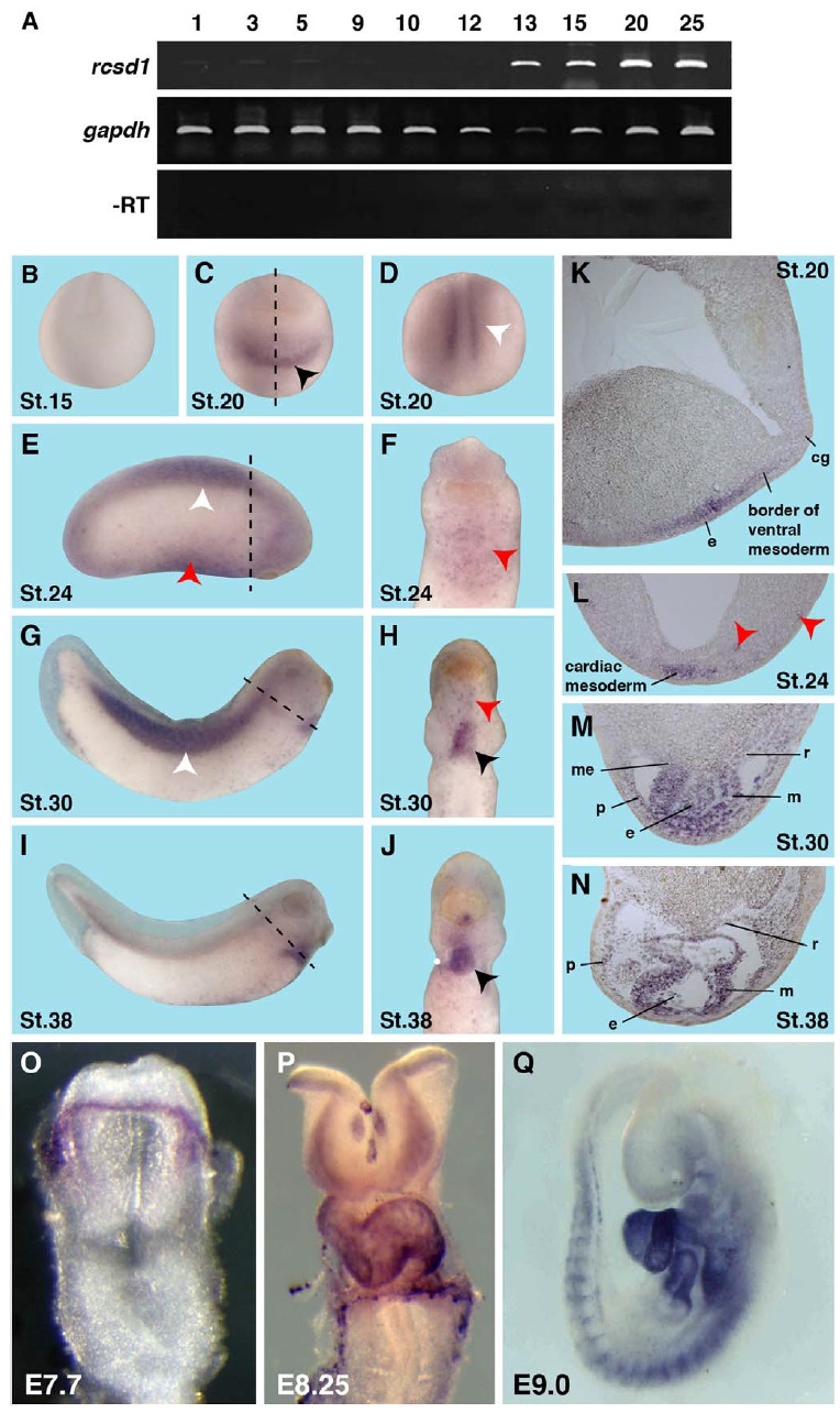 and 38 (N, transversal section). e, endocardium; m, myocardium; me, mesocardium; p, pericardium; r, pericardial roof. O-Q Expression of Rcsd1 during mouse embryogenesis. Rcsd1 is expressed in the developing murine heart at embryonic stages E7.7 (O), E8.25 (P) and E9.0 (Q).
