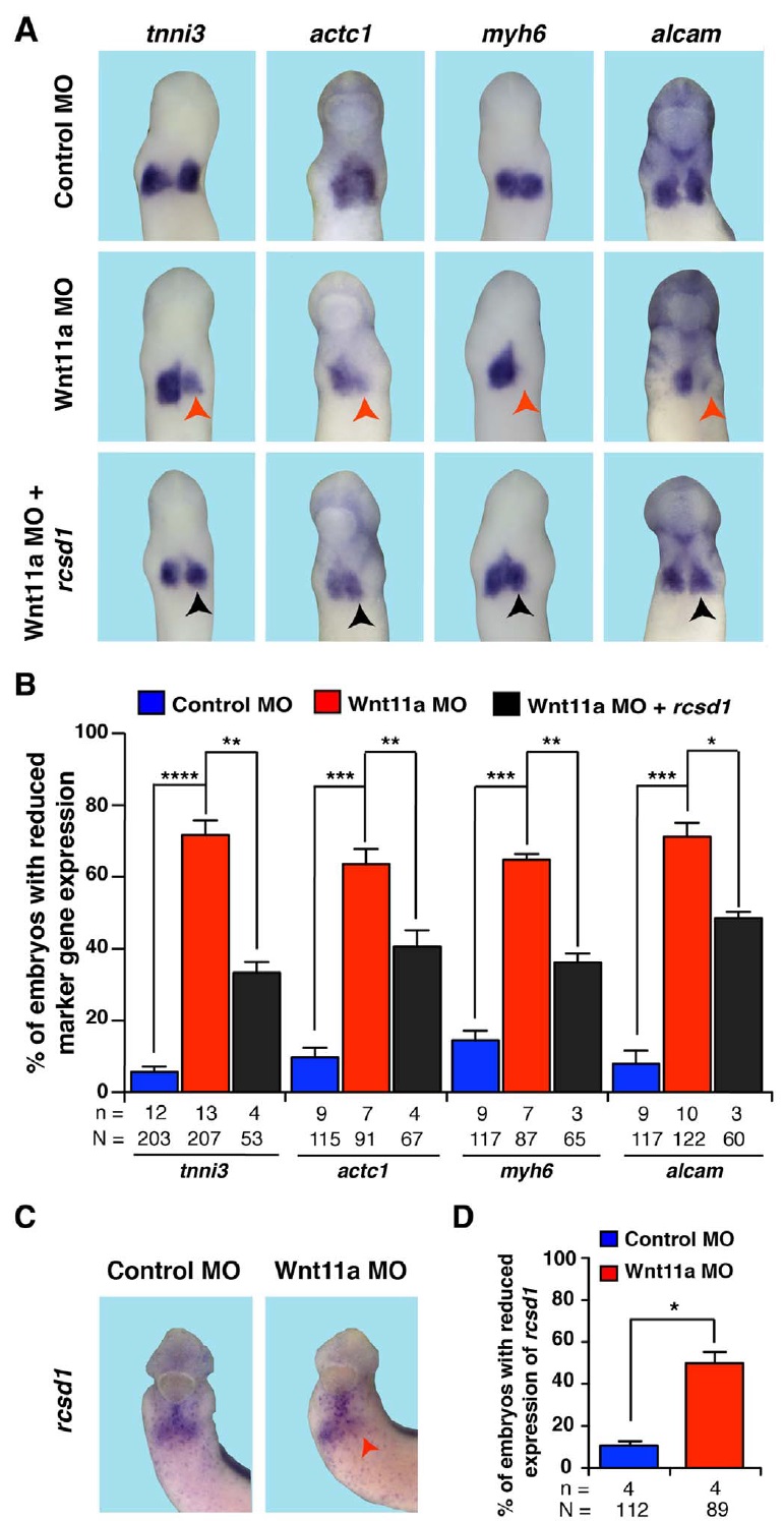Fig. 5. : Rcsd1 acts downstream of Wnt11a. A. Unilateral injection of Wnt11a MO leads to inhibition of cardiac marker gene expression (red arrowheads), which is restored by the co-injection of Xenopus full-length rcsd1 RNA (black arrowheads). B. Quantitative presentation of data shown in A. C. Unilateral injection of Wnt11a MO leads to inhibition of rcsd1 expression (red arrowheads) D. Quantitative presentation of data shown in C. n, number of independent experiments; N, number of embryos analysed. Error bars indicate standard error of the means (s.e.m.). *, pâ¤0.05, **; pâ¤0.01; ***; pâ¤0.001; ****, pâ¤0.0001; calculated by a non-parametric Mann-Whitney rank sum test.