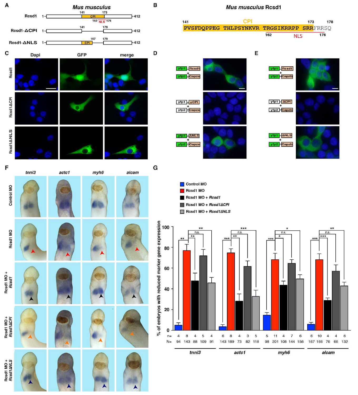 Fig. 6. : Rcsd1 functionally interacts with CapZ in the cytosol. A. Schematic overview of used murine Rcsd1 and deletion constructs. Rcsd1 contains a CPI (capping protein interaction) and a NLS (nuclear localization signal) motif. Numbers indicate amino acids in the Rcsd1 protein. B. Amino acid sequence of murine CPI and NLS motifs. Numbers indicate amino acids in the Rcsd1 protein. C. Transfection of the full-length EGFP-Rcsd1 fusion construct revealed that Rcsd1 is localized in the nucleus and cytosol (upper row). Deletion of CPI (middle row) or NLS (lower row) in Rcsd1 leads to a cytosolic localization. Scale bar: 100 μm. D-E. Split YFP complementation assays. Murine full-length Rcsd1 and Rcsd1δNLS (labelled as δNLS) interact with CapZa and CapZb whereas Rcsd1δCPI (labelled as δCPI) does not. Scale bars D, E: 10 μm. F. Rcsd1 MO was unilaterally injected along with different murine Rcsd1 constructs and the expression of the cardiac markers tnni3, actc1, myh6 and alcam was monitored at stage 28 (ventral views). Reduced marker gene expression upon loss of Rcsd1 (red arrowheads) was rescued by co-injection with the full-length murine Rcsd1 construct (Rcsd1, dark grey arrowheads) and Rcsd1δNLS (dark blue arrowheads). Rcsd1δCPI however (orange arrowheads) was not able to restore marker gene expression. G. Quantitative presentation of data shown in F. n, number of independent experiments; N, number of analysed embryos. Error bars indicate standard error of the means (s.e.m.). n.s., not significant, *, pâ¤0.05; **, pâ¤0.01; ***, pâ¤0.001; calculated by a non-parametric Mann-Whitney rank sum test.