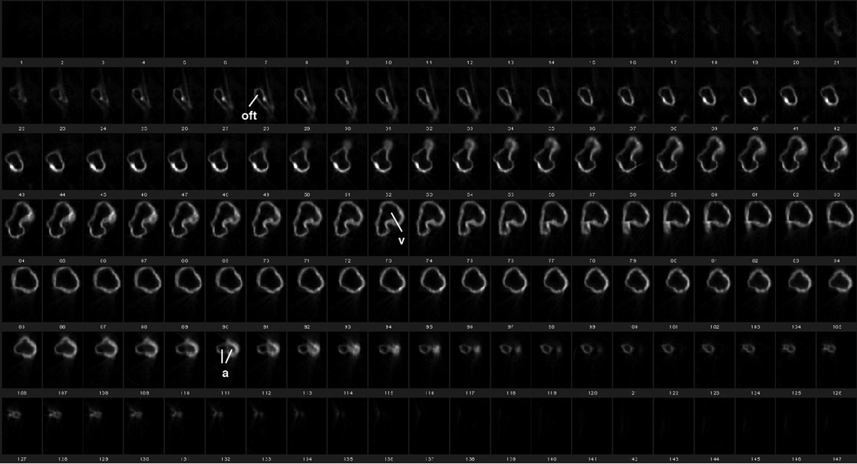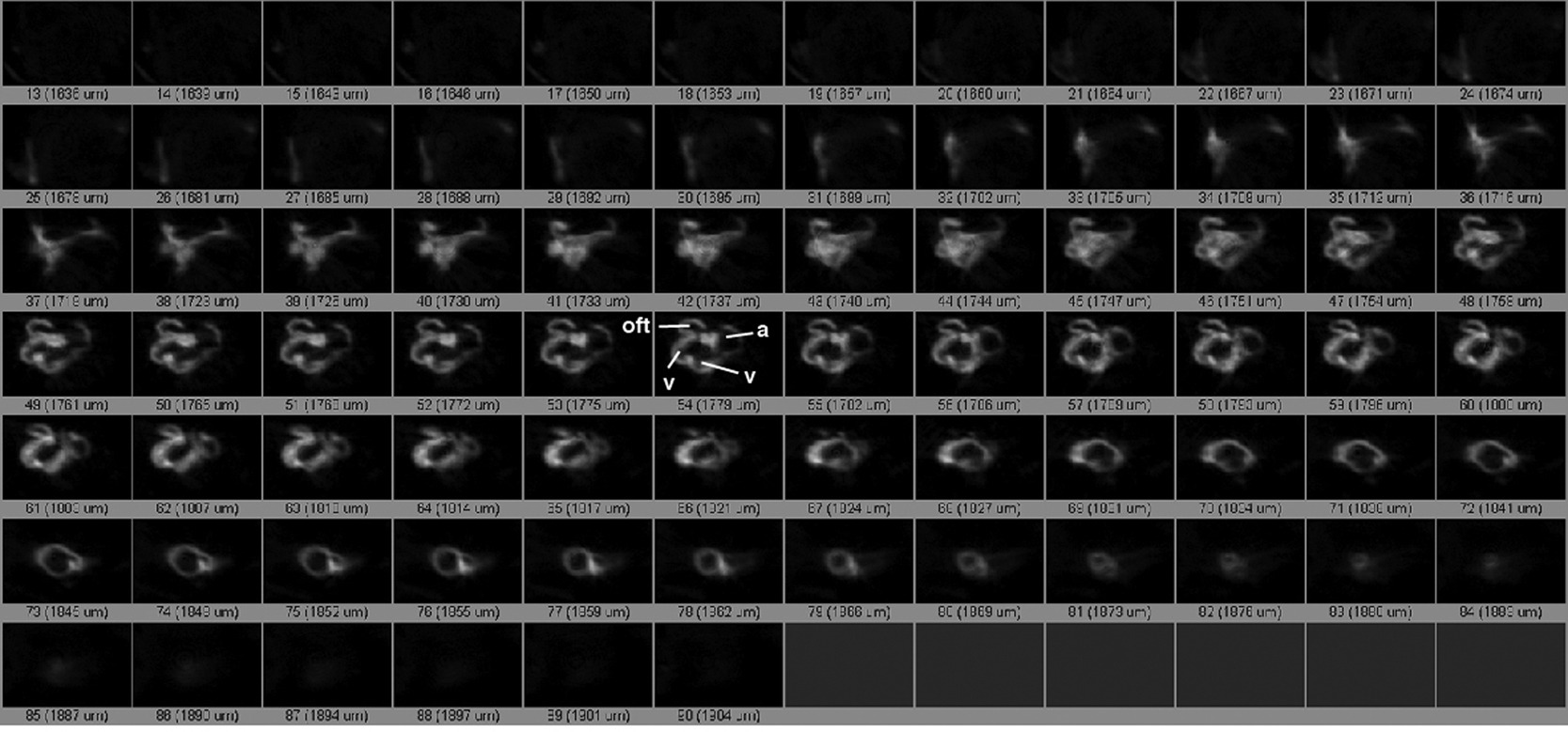 Serial sections through a heart of a Control MO injected embryo derived from OPT image stacks. a, atrium; oft, outflow tract; v, ventricle.