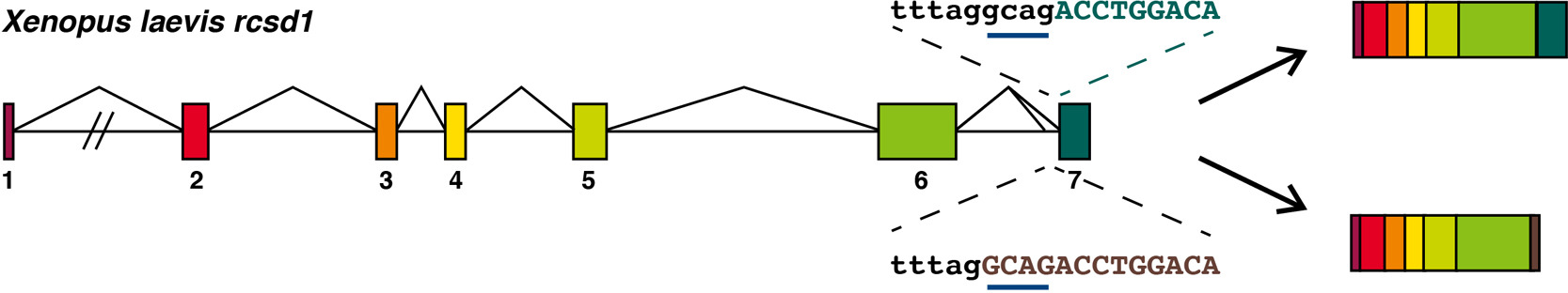Xenopus laevisRcsd1. The Rcsd1 variant found during early Xenopus embryogenesis is shorter at the C-terminus due to alternative splicing at the boundary between intron 6 and exon 7. Small letters indicate intron sequences, capital letters indicate exon sequences.