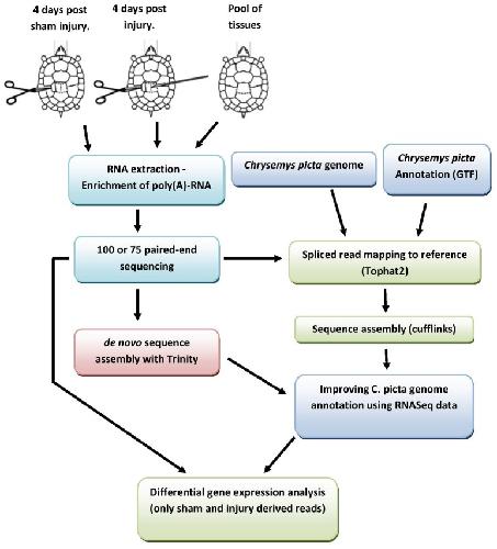 Figure 1. Schematic depiction of the experimental pipeline used to generate an “enriched” C. picta mapping reference and subsequent differential gene expression analysis. Further details in section under the title “de novo transcriptome assembly” and Figures S1–S6 in supplementary file.