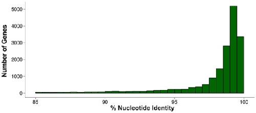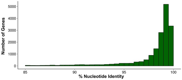 Figure 2. Distribution of nucleotide identities between T. scripta and C. picta orthologous sequences.