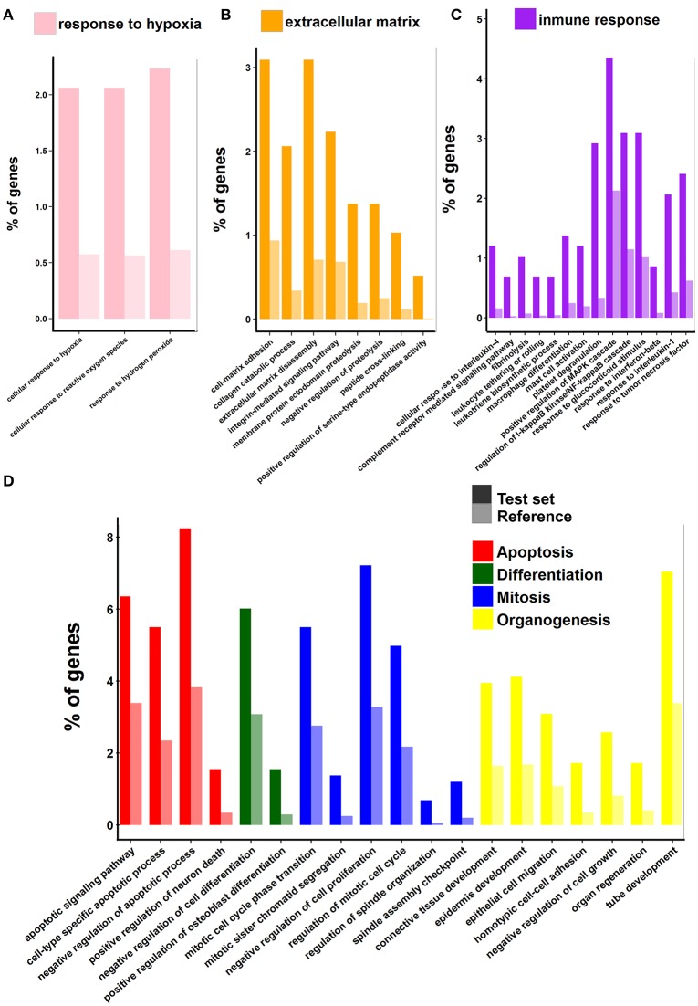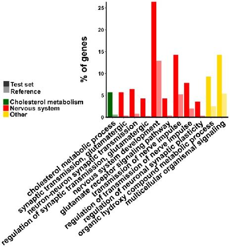 Figure 3. Gene Ontology enrichment analysis of down-regulated genes. Test set refers to the group of differentially expressed (DE) genes (in this case only down-regulated ones) and reference to all genes in the genome. Only some representative (and informative) terms were included in the figure.