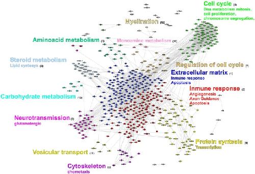 Figure 5. Protein Interaction network of T. scripta DE genes. Nodes represent genes and lines interactions. Node colors are used to identify the cluster to which the genes belong to. The most relevant cellular processes and functions associated to each cluster are specified by the legend next to it.