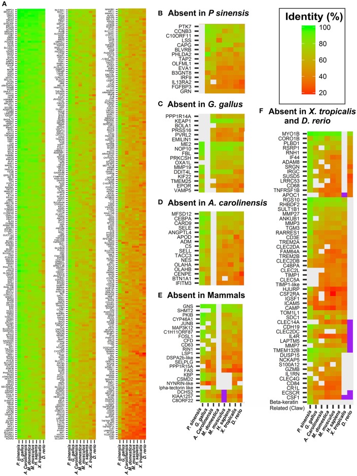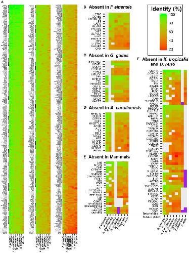 Figure 6. Amino acid identity levels of DE genes in species representative of vertebrate taxonomic diversity. Identity levels are indicated by the color scale shown in the top leftmost corner of figure. Values indicate the identity between T. scripta and the species indicated at the bottom of heatmap. Groups of genes for which no ortholog could be found in a given species are presented in separated panels. (A) Genes that are present all the vertebrate species used in this study. Panels (B–F) show genes absent in a particular species, or clade, as indicated in the sub-title of the respective panel. Genes for which an ortholog could not be unambiguously identified in a given species are indicated in violet.