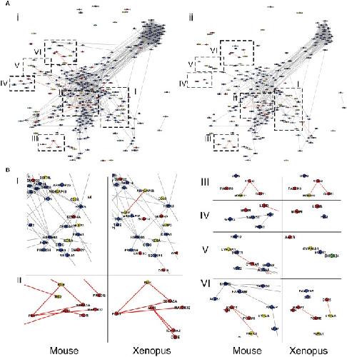Figure 7. Comparison of gene expression responses between turtles and mice (i) and turtles vs. NR-Xenopus (ii). Panel (A) genes having double coincident behavior are colored in blue and green (for up- and down-regulated, respectively), whereas those exhibiting opposite responses are colored in red and yellow, for up- and down-regulated respectively. Further details about definitions on gene expression behavior in the text. Groups of genes of interest are boxed with dashed lines and shown in greater magnification in panel (B).