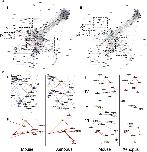 Figure 4. Gene Ontology enrichment analysis of genes that are up-regulated. Symbols as in Figure 3. Panels (A–D) show relevant groups of GO terms. The group of GO categories is indicated at the top of each panel.
