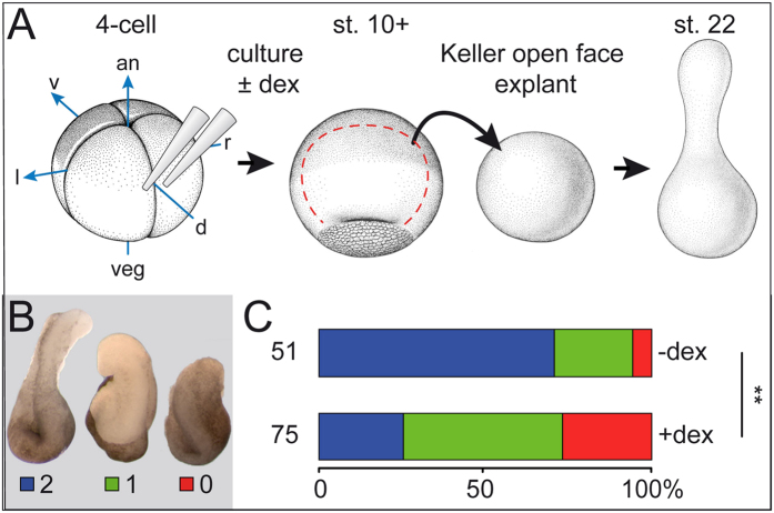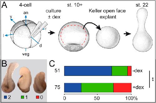 Figure 2. Gsc inhibits CE in Keller open face explants.(AâC) CE defects in Keller open face explants (schematically depicted in (A) upon activation of Gsc-GR. (B) Explants were classified as class 2 (blue) when extensions showed a constriction (left), as class 1 (green) when elongation occurred without constriction (middle), and as class 0 (red) when no elongation ensued (right)38. an, animal; uninj., uninjected control; d, dorsal; l, left; r, right; v, ventral; veg, vegetal. (C) Summary of results. |