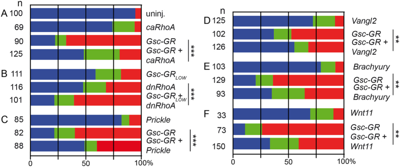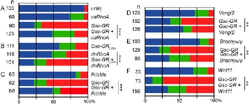 Figure 6. Rescue of Gsc-GR mediated NTD/BPD by Wnt/PCP pathway components.Xenopus embryos were injected with the indicated mRNAs into the dorsal marginal region of all cells at the 4-cell and cultured to stage 22. Dex was added when Gsc-GR was used. Specimens were scored for normal appearance (blue bars), NTD (green) and BPD (red). (A) constitutively active RhoA; (ca; A) dominant-negative (dn) RhoA; (C) Prickle; (D) Vangl2; (E) Brachyury; (F) Wnt11. Uninjected embryos (uninj.) served as controls. Note that rescue was observed upon co-injection of Gsc-GR with ca-RhoA, Prickle, Vangl2, Brachyury and Wnt11, while enhanced phenotypes were seen with co-injected dn-RhoA. As embryos in the latter combination showed high rates of lethality, the dose of injected Gsc-GR was reduced from 400âpg to 160âpg. Cf. Table S1 for numbers and statistics. |