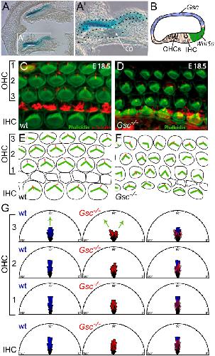 Figure 8. Disrupted alignment of outer hair cells (OHCs) in the cortical organ of Gsc knockout embryos.(A) Gsc transcription (blue) locates opposite of the cortical organ (CO). (B) Schematic depiction of Gsc expression in blue and Wnt5a expression in green. OHCs and inner hair cells (IHC) are highlighted by arrows. (C–G) Confocal imaging of kinocilia (red, tubulin) and stereocilia (green, phalloidin) in the cortical organ of Gsc knockout mouse embryos (D,F), compared to wt littermates (C,E) schematically depicted in (E,F). (G) Quantification of alignments, depicted as rose plots. According to the angle of deviations from the normal perpendicular orientation (90°), vectors were plotted in 11.25° sectors. The area of a sector represents the number of cells with this directionality. Note that significantly higher deviations from the normal perpendicular orientation (90°) were observed in OHC3 of Gsc knockout specimens (middle, red, n = 390) compared to wildtype littermates (left, blue, n = 308, p = 0.03). |