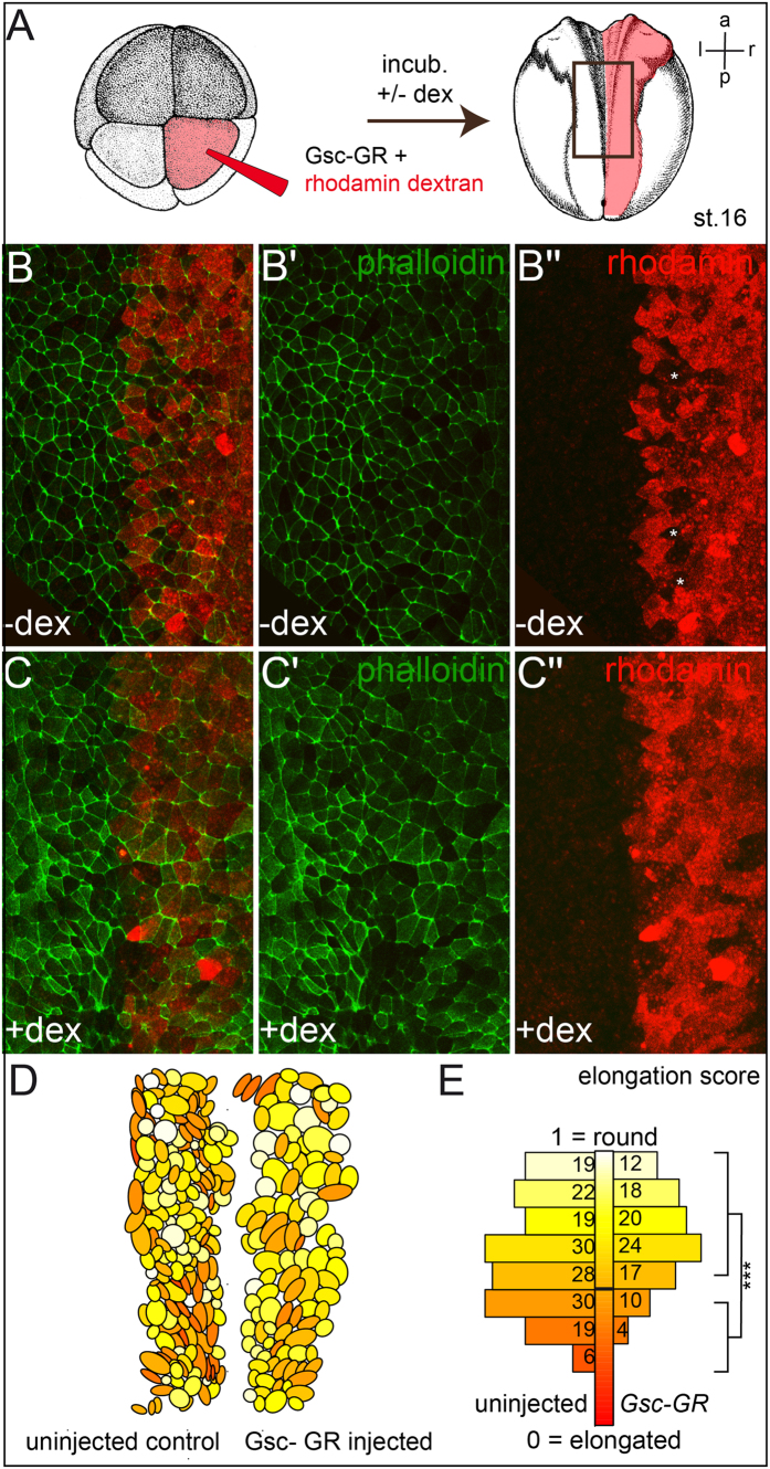 Figure 3. Gsc compromises bipolar elongation of neural plate cells.(A) Targeted injection scheme of Gsc-GR and linage tracer (rhodamine red) into the right side of the neural plate (B,C). Drawings taken from Xenbase (www.xenbase.org/anatomy/alldevo.do)97. (D,E) Analysis of cell elongation. The color gradient ranging from pale yellow (round, widthâ=âlength, 1) to dark red (elongated, 0) exemplifies the change from bipolar cells on the un-injected (right) side towards rounded cells upon activation of Gsc-GR (D). (E) Significant decrease of percentage of elongated cells (elongation score <1/2) after Gsc-GR missexpression. a, anterior; l, left; p, posterior; r, right. |
