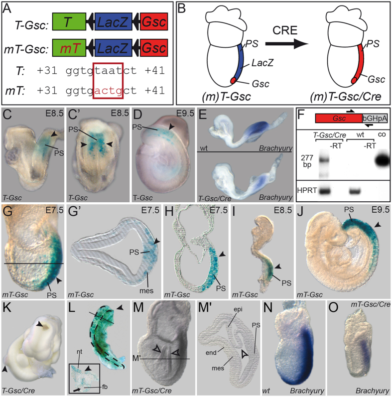 Figure 4. Gsc-mediated CE phenotypes in the mouse.Conditional misexpression of Gsc in the entire primitive streak of the mouse. (A) Constructs used to generate transgenic mouse lines. T, wt Brachyury streak enhancer; mT, mutant enhancer not repressed by Gsc; triangles, loxP sites. (B) Schematic depiction of Gsc (red) and LacZ (blue) expression at E7.5 before (left) and after (right) Cre-mediated recombination. (C,D) LacZ expression (arrowheads) in the primitive streak (PS) mesoderm of E8.5 (lateral view in C, posterior view in C’) and E9.5 (D) T-Gsc embryos. (E) Reduced Brachyury mRNA expression upon transgene activation (T-Gsc/Cre, lower panel) compared to wt embryo (upper panel). (F) Detection of transgenic Gsc mRNA by RT-PCR from T-Gsc/Cre and wt E8.5 embryos. A 277 bp fragment specific for transgenic Gsc mRNA was amplified using a Gsc primer and a primer derived from the bovine growth hormone polyadenylation (bGHpA) signal present in the construct. Note that no signal was detected in wt embryos, and that a band identical in size to one amplified from the T-Gsc control plasmid was seen in T-Gsc/Cre embryos. (G–J) LacZ expression (arrowheads) in the PS mesoderm of E7.5 (G,H) plane of histological section G’ indicated in (G), E8.5 (I) and E9.5 (J) mT-Gsc embryos. (K) Cranial and caudal NTD (arrowheads) in E10.5 T-Gsc/Cre embryo. (L) Craniorachischisis in chimeric E10.5 embryo generated from ES cells expressing LacZ and Gsc. Note that, except for the forebrain region (arrow; cross section shown in inset), the entire neural tube stayed open (arrowheads). (M) Malformation of mt-Gsc/Cre gastrula embryo. Note irregular folding of epiblast (open arrowheads). (M’) Histological section at level indicated in (M). (N,O) Repression of Brachyury transcription in mT-Gsc/Cre (O) compared to wt (N) E7.5 embryos. end, endoderm; epi, epiblast; fb, forebrain; mes, mesoderm; nt, neural tube; PS, primitive streak. |