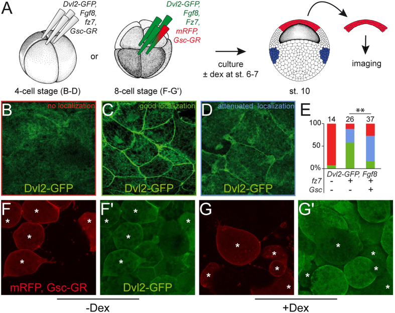 Figure 5. Gsc-GR inhibits membrane recruitment of Dvl2.(A) Co-injection of mRNAs as indicated into the animal region of all cells at the 4-cell stage or of selected cells at the 8-cell stage. Embryos were culturedâ±âdex (added at st. 6/7), animal cap tissues were excised at stage 10 and subjected to live imaging. (BâE) Membrane localization of Dvl2-GFP was significantly impaired upon Gsc-GR activation. (BâD) Examples of specimens from the same batch of embryos and photographed with the same exposure times showing lack of localization (B; red), good (C; green) and attenuated localization (D; blue). (E) Quantification of results (pâ=â0.002). (F,G) Cell-autonomous effect of Gsc-GR. Injection of Gsc-GR in 1/4 animal cap cells at the 8-cell stage (cf. A) resulted in attenuation of Dvl2-GFP membrane recruitment upon dex treatment (cf. Fâ and Gâ). *mark Gsc-GR-injected cells, as revealed by fluorescence of lineage tracer mRFP. |