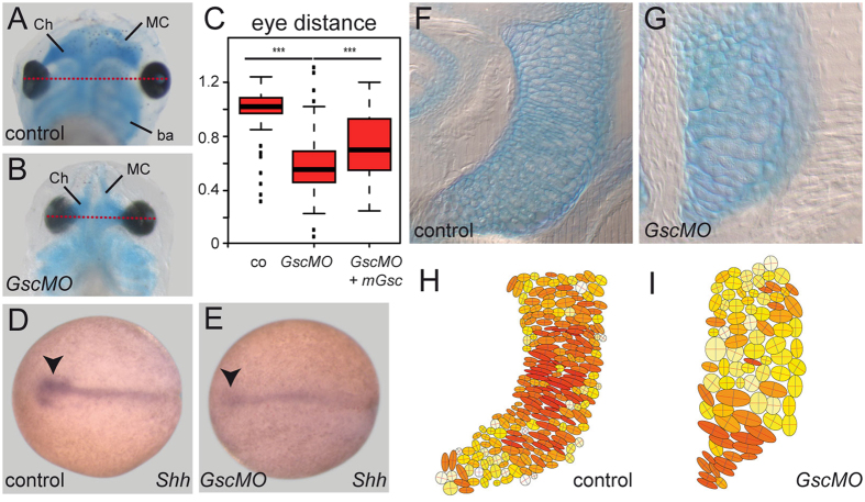 Figure 7. Prechordal plate and cartilage defects in Gsc morphant Xenopus tadpoles.(AâE) Prechordal plate defects. (AâC) Close-set eyes in Gsc morphants. Distance between left and right eye (red lines) was reduced in morphants. Arithmetic mean of control specimens was set to 1.0 in (C). Note that this phenotype was rescued by co-injection of a mouse Gsc cDNA construct. (D,E) Shh mRNA expression in control (D) and high dose Gsc morphant (E). Note that the prechordal plate (arrowheads) was severely reduced in morphants. (FâI) Cartilage phenotypes in Gsc morphant frog tadpoles. Cartilage was stained with alcian blue in wt (F,H) or Gsc morphant (G,I) tadpoles at stage 45. Shape of cartilage cells of was analyzed in frontal sections of embryos (F,G). (H,I) Cells were outlined with ImageJ and aspect ratios were calculated and visualized. Cell shapes are indicated by a color gradient from yellow to red, with round cells depicted in light yellow and elongated bipolar cells in deep red. Note that the majority of cartilage cells in Gsc morphants had lost their bipolar appearance. |