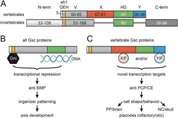 Figure 9. Vertebrate-specific Gsc functions: a model.(A) Domain structure of invertebrate and vertebrate Gsc proteins; numbers indicate ranges of amino acids. The engrailed homology (eh1/GEF) repression domain and the homeodomain (HD) are common to all Gsc proteins. Two highly conserved domains (X, Y) flanking the HD emerged at the base of the vertebrates. Note that invertebrates, besides lacking X/Y, possess variable length N- and C-terminal sequences and that the linker region between eh1/GEF and HD also varies greatly in length. (B) All Gsc proteins have the potential to act as transcriptional repressors through HD-binding to DNA and Groucho-recruitment to eh1/GEF. When assayed in Xenopus, Drosophila and vertebrate Gsc proteins act in organizer patterning and axis development through their conserved anti-BMP function. (C) Vertebrate Gsc proteins in addition affect cell shape and behavior through their anti PCP/CE function. We propose that X- and Y-domain interacting factors XIF and YIF function in recruiting novel transcriptional target genes under Gsc control. We further propose that this novel function of Gsc co-evolved with the vertebrate-specific novelties of an enlarged brain, skull and placodes, as vertebrate Gsc is expressed in the prechordal plate/floor plate of the diencephalon, neural crest mesenchyme and derivatives as well as otic vesicle/nasal cavity. |