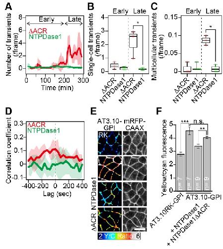 Ca2+ transients in embryos expressing an E-NTPDase1 mutant (δACR; red) or