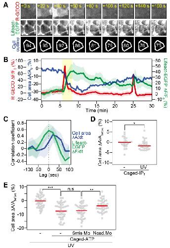 cells, 2 embryos (+UV). (E) Relative apical cell area 50 s after photolysis of