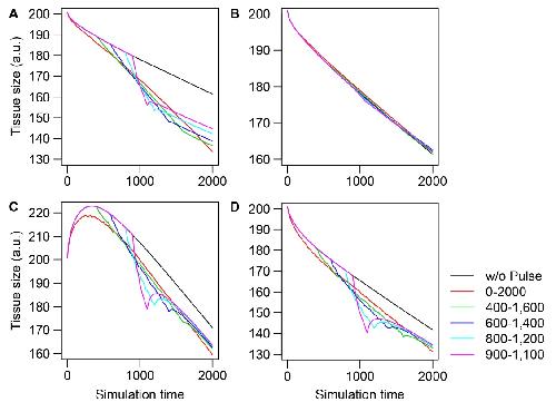 set to a probability ( pe) of 1, 0.5 or 0.25. (E) Mean tissue sizes during the time course of the simulations, when the active period in which the pulses were