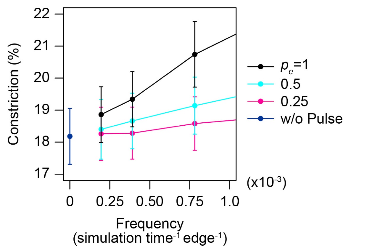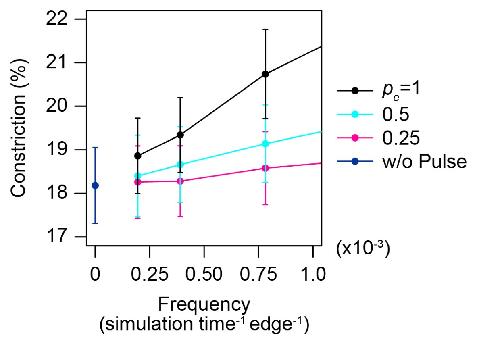 Relationship between the pulse frequency and mean constriction at the end of the simulations. The proportion of cell edges undergoing contraction per cell was