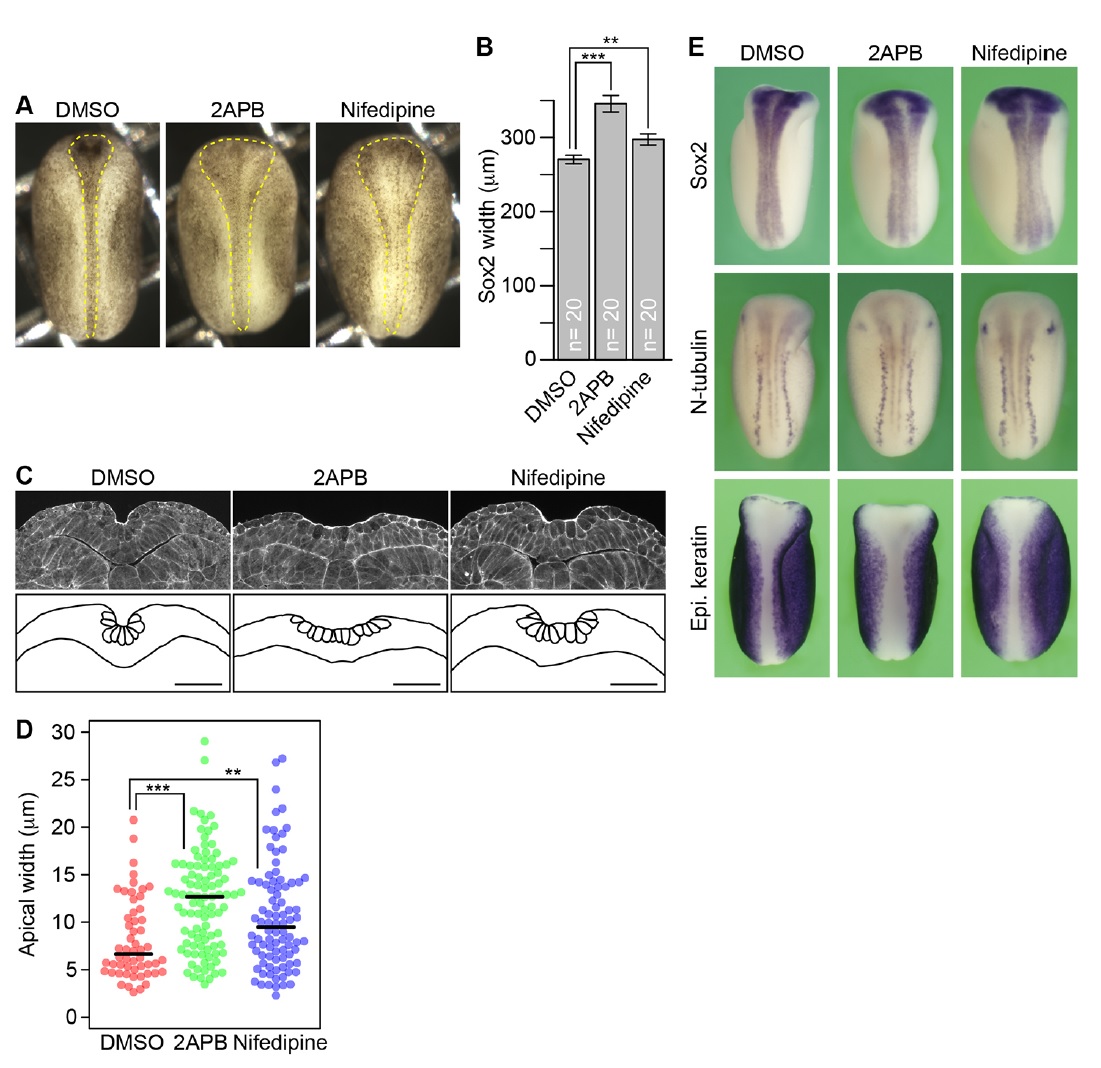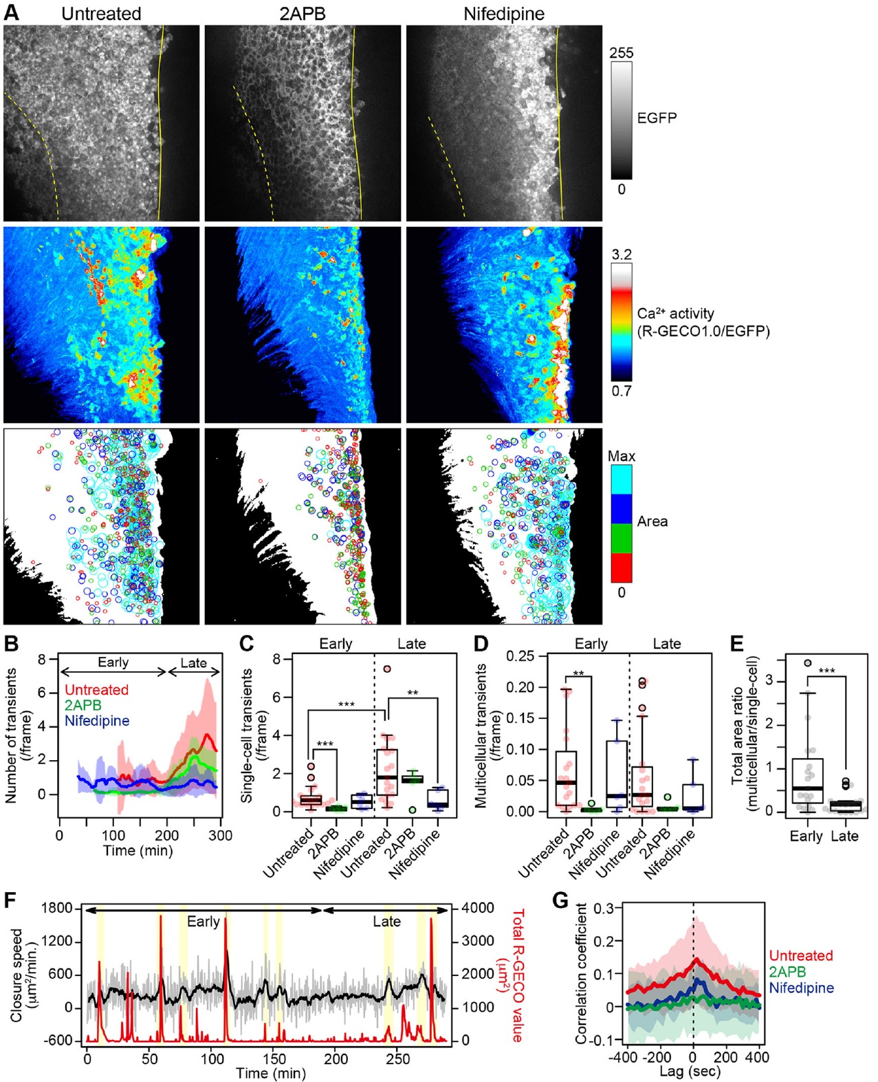 value. The shaded area indicates s.d. n=19 (untreated), 5 (2APB-treated) and 6 (nifedipine-treated) embryos. Results in B-E andGare for the same data set. In C-E,