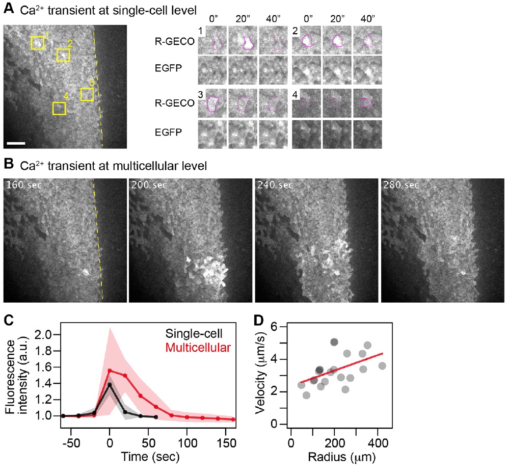 Ca2+ transients at the single-cell (i) and multicellular (ii) levels are shown. Cells marked by blue stars are activated. Activated cellular edges in an activated