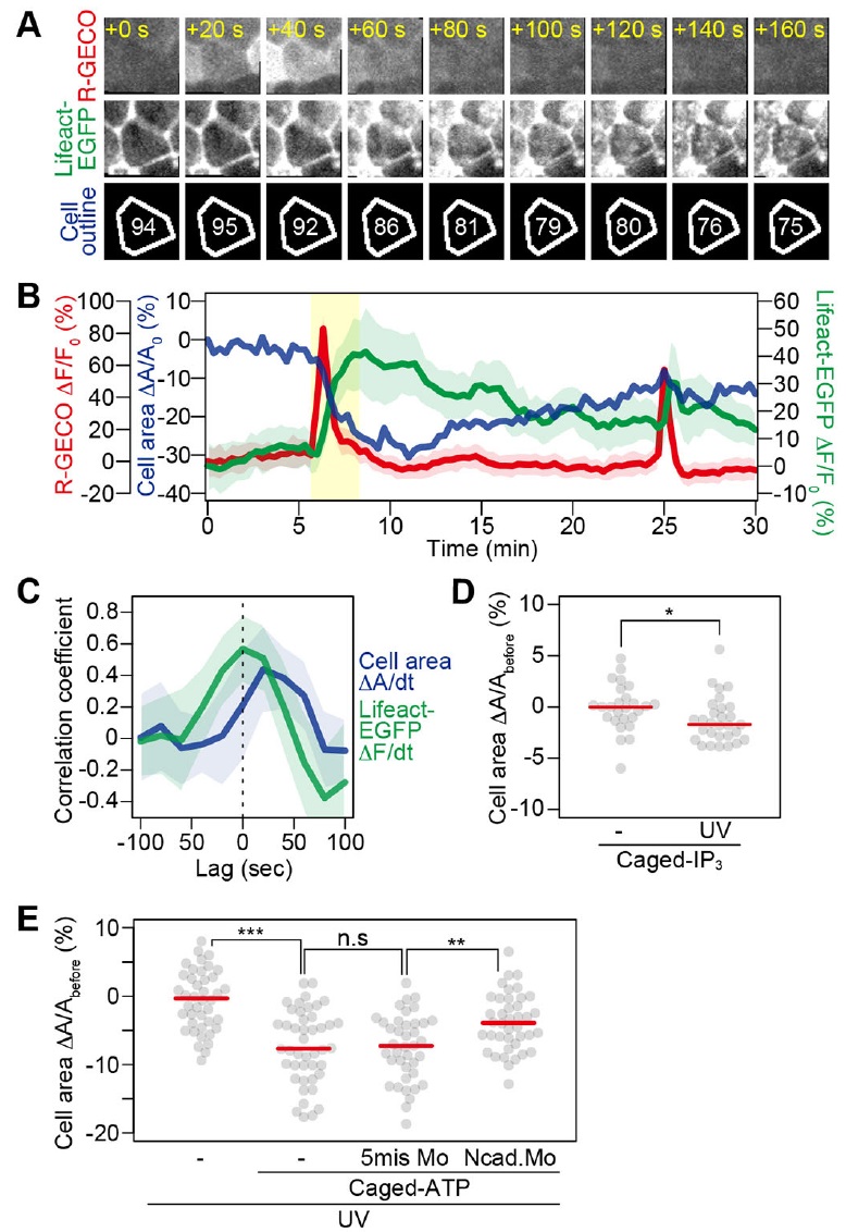 R-GECO1.0 (red) and medial Lifeact-EGFP (green), and the relative apical cell