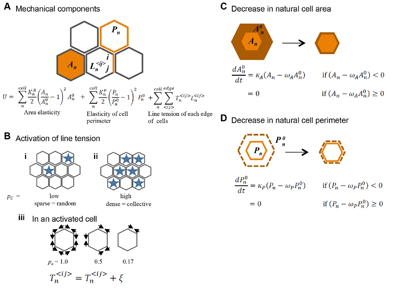 The regulation of the natural cell area and of the natural cell perimeter are described in C and D, respectively. The bright orange regions in C are the actual cell