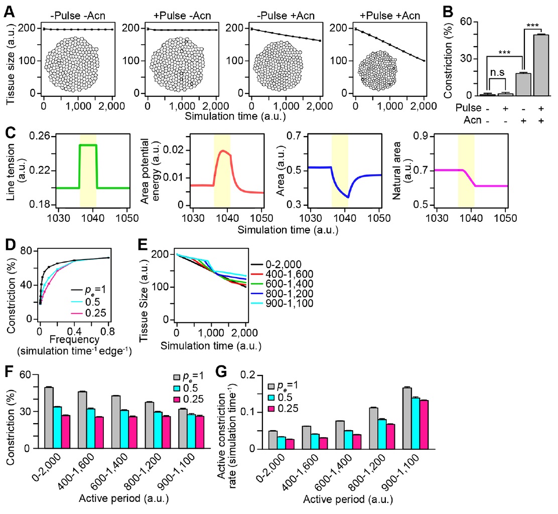 representative images at the end of each simulation. (B) Mean tissue constriction at the end of the simulations. In A and B, the pulsed contractions were introduced