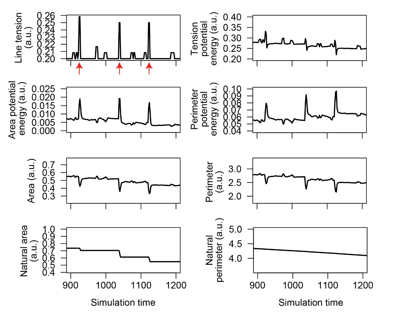 significant. (C) Mean line tension, potential energy from the elasticity of apical surface area, area and natural area of single cell (#58) during the time course of the