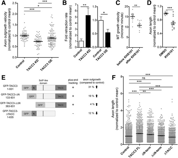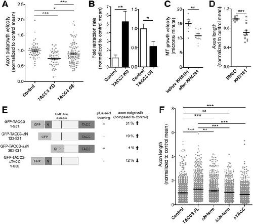 Fig. 1. TACC3 promotes axon outgrowth velocity and prevents spontaneous axon retractions. a, Axon outgrowth velocity is significantly decreased in TACC3-depleted axons by 27% (nâ=â56) and in TACC3 OE, to a lesser extent, by 11% (nâ=â106) compared to control (GFP only) conditions (nâ=â58). b, Retraction rate increased 5 fold in TACC3 KD (nâ=â107) and decreased 0.6 fold in TACC3 OE (nâ=â155) in comparison to their corresponding non injected (nâ=â95) and GFP injected (nâ=â180) controls respectively. c, d, MT growth velocity (DMSO, nâ=â9, KHS-101, nâ=â9) (c) and axon outgrowth length (DMSO, nâ=â8, KHS-101, nâ=â12) (d) are significantly reduced by 28 and 26% respectively after acute depletion of TACC3 by the inhibitor KHS101. e, Schematic representation of GFP-tagged TACC3 full-length and deletion constructs, along with plus-end tracking ability (denoted by â+â) and impact on axon outgrowth length. f, Quantification of axon outgrowth length in cultured neural explants of GFP injected control (nâ=â997), full-length GFP-TACC3 (1-931aa) (nâ=â787), GFP-TACC3-δN (133â931) (nâ=â613), GFP-TACC3- δδN (363â931) (nâ=â563) and GFP-δTACC domain (1-635aa) (nâ=â764). *pâ<â0.05, **pâ<â0.01, ***pâ<â0.001. ns not significant. nâ=âaxon/growth cone number
