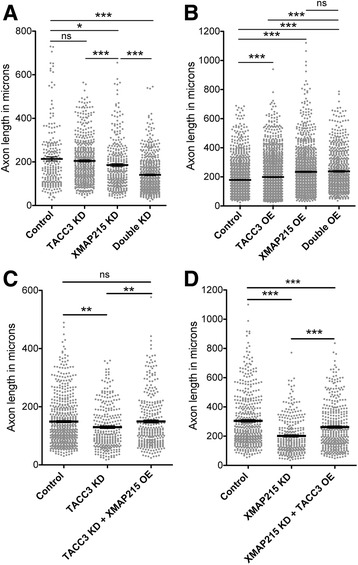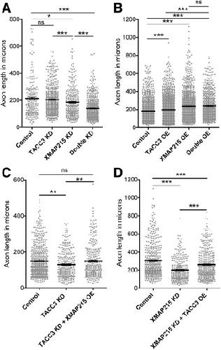 Fig. 3. TACC3 and XMAP215 interacts to promote axon outgrowth. a, b, Combinatorial reduction or elevation of TACC3 and XMAP215 levels reveals synergistics in axon outgrowth. Knocking down both TACC3 and XMAP215 (nâ=â312) showed significant reduction in axon length in comparison to control (nâ=â219), TACC3 KD (nâ=â487) and XMAP21 KD alone (nâ=â312) (a). Overexpression of both (nâ=â654) showed significant increase in axon length in comparison to control (nâ=â1288) and TACC3 OE (nâ=â1585), while double overexpression had no additive effect in comparison to XMAP215 OE (nâ=â1227) (b). c, d, Reduced axon outgrowth in TACC3 KD (nâ=â289) (c) or XMAP215 KD (nâ=â299) (d) neurons is rescued by the overexpression of XMAP215 (nâ=â313) or TACC3 (nâ=â397), respectively. *pâ<â0.05, **pâ<â0.01, ***pâ<â0.001. ns not significant. nâ=âaxon number